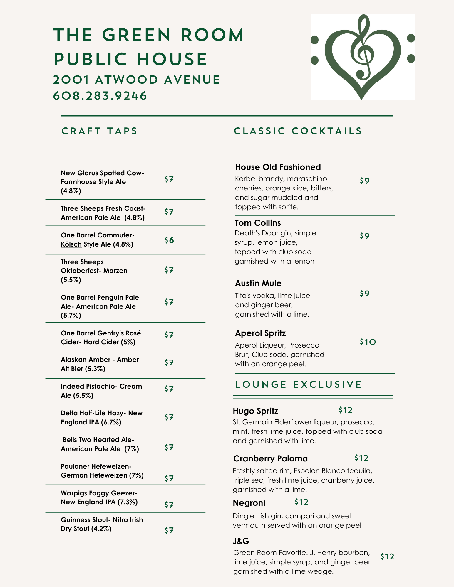 We offer a wide variety of draft, canned, and bottled beer, seasonal cocktails, and many NA and THC options. Our menu changes regularly, so check back to see our new offerings.